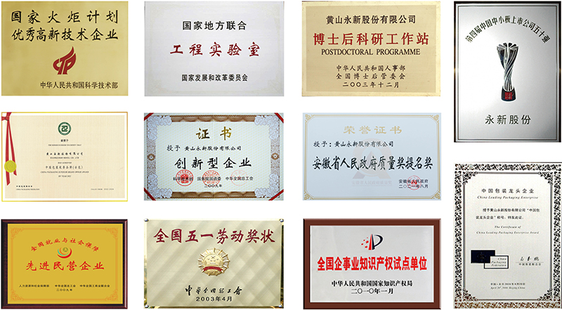 全國五一勞動獎狀;國家創新型企業;中國創新型企業100強;中國包裝龍頭企業;中國包裝優秀示范品牌;國家首批資源節約型環境友好型試點企業;全國就業與社會保障先進民營企業;國家火炬計劃重點高新技術企業;中國中小企業板上市公司50強;全國守合同重信用企業;全國先進包裝企業;全國企事業單位知識產權試點單位;全國輕工業先進卓越績效企業;海關AA級企業;中國醫藥包裝優秀單位;安徽省人民政府質量獎提名獎